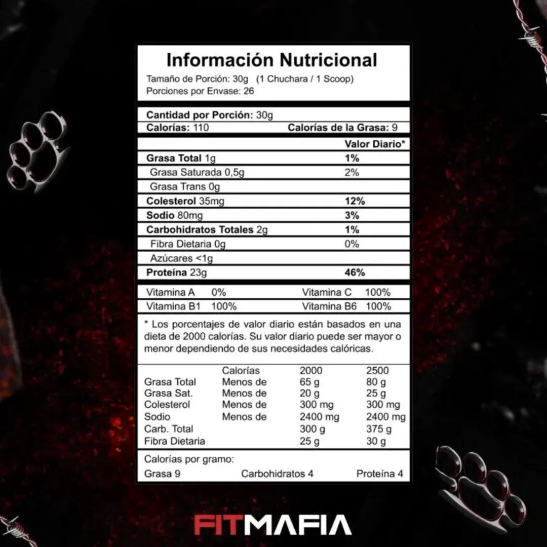 Ingredientes: Proteína Concentrada de Suero de Leche, Proteína Concentrada de Leche, Proteína Aislada de Soya, Cocoa (Chocolate), Sabor Idéntico al Natural (Vainilla y Chocolate), Goma Xanthan (Espesante), Carboximetilcelulosa (Estabilizante), Lecitina de Soya (Estabilizante), Dióxido de Silicio (Anticompactante), Sucralosa (Edulcorante), Benzoato de Sodio (Conservante) (1000mg/kg), Vitamina C (Ácido Ascórbico), Lactasa en Polvo, Vitamina B6 (Piridoxina), Vitamina B1 (Tiamina).